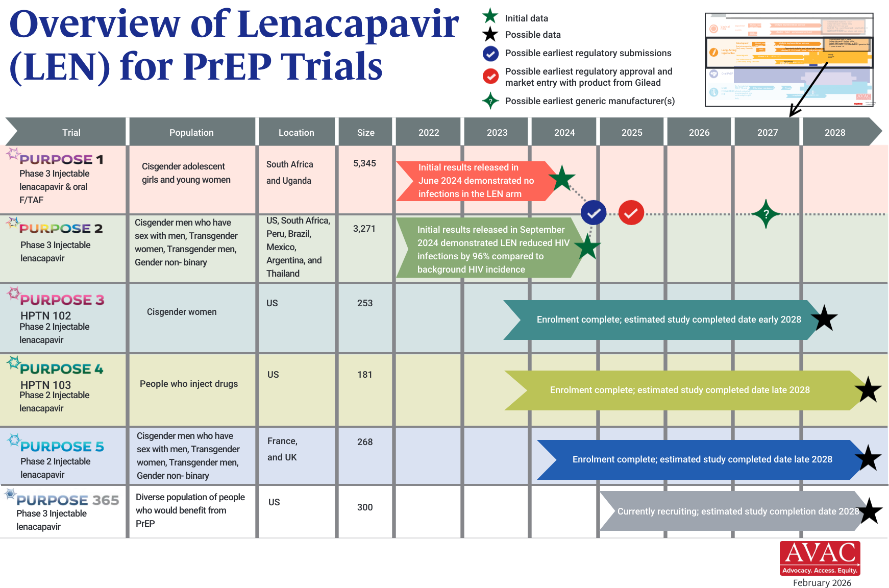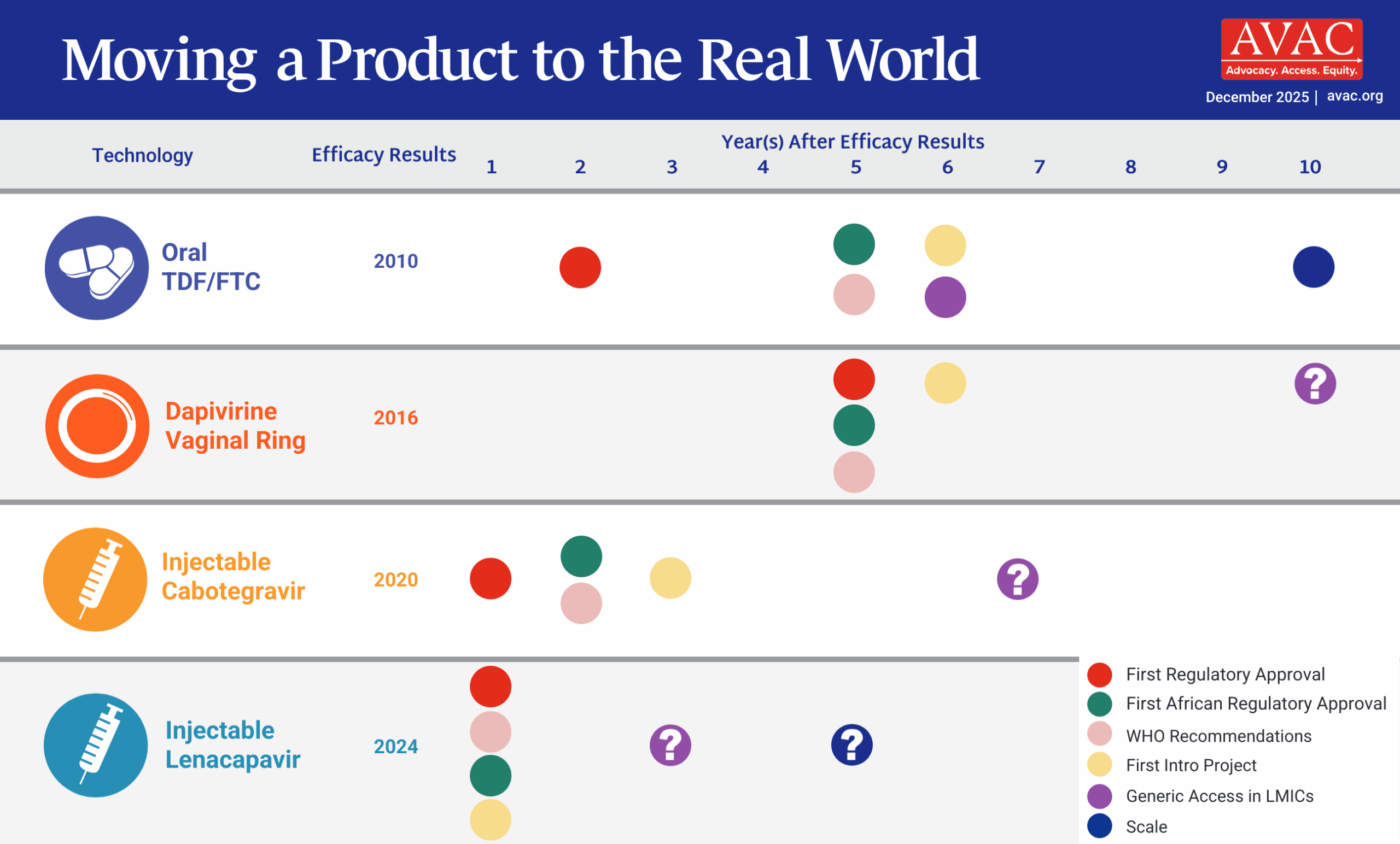 This dashboard provides a timely snapshot on the progress of accelerating access to long-acting PrEP products. The graphics featured here track regulatory approvals, volumes, ongoing and planned implementation science studies, and non-profit prices for approved longer-acting PrEP products, including injectable cabotegravir, injectable lenacapavir, and the dapivirine vaginal ring. The dashboard is updated quarterly by AVAC, Secretariat to the Coalition to Accelerate Access to Long-Acting PrEP.