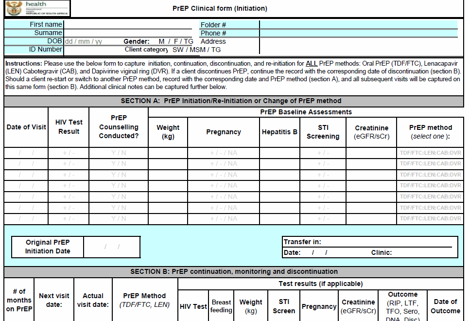 This suite of clinical reporting forms, developed by South Africa’s National Department of Health, can be used for PrEP reporting, including injectable lenacapavir (LEN). The download folder includes forms for PrEP initiation, continuation, pregnancy outcome reporting, and seroconversion reporting.