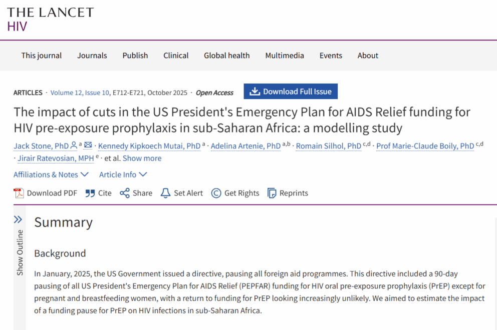 This article from The Lancet HIV estimates the impact of the PEPFAR funding pause for PrEP on HIV infections in sub-Saharan Africa.